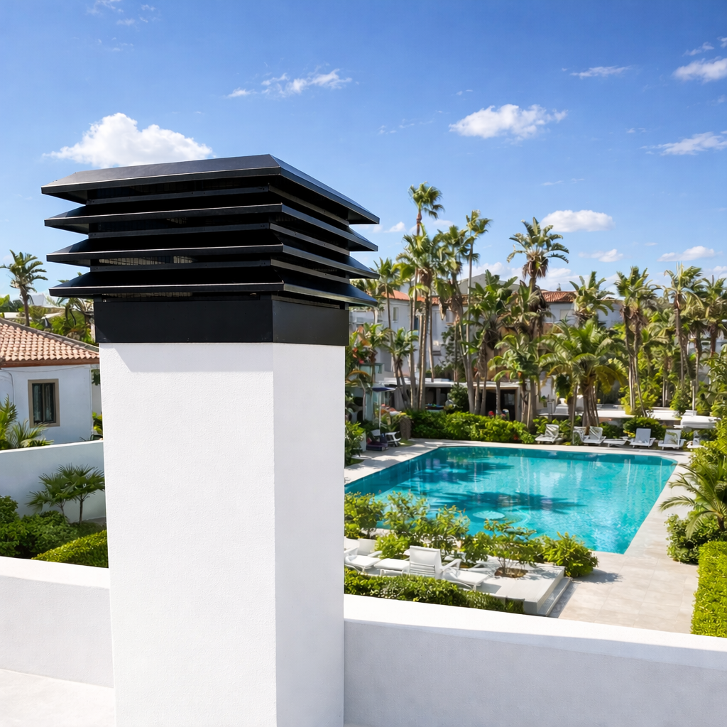 - Cuatro aspas antilluvia diseñadas para facilitar la extracción de humos y gases.
