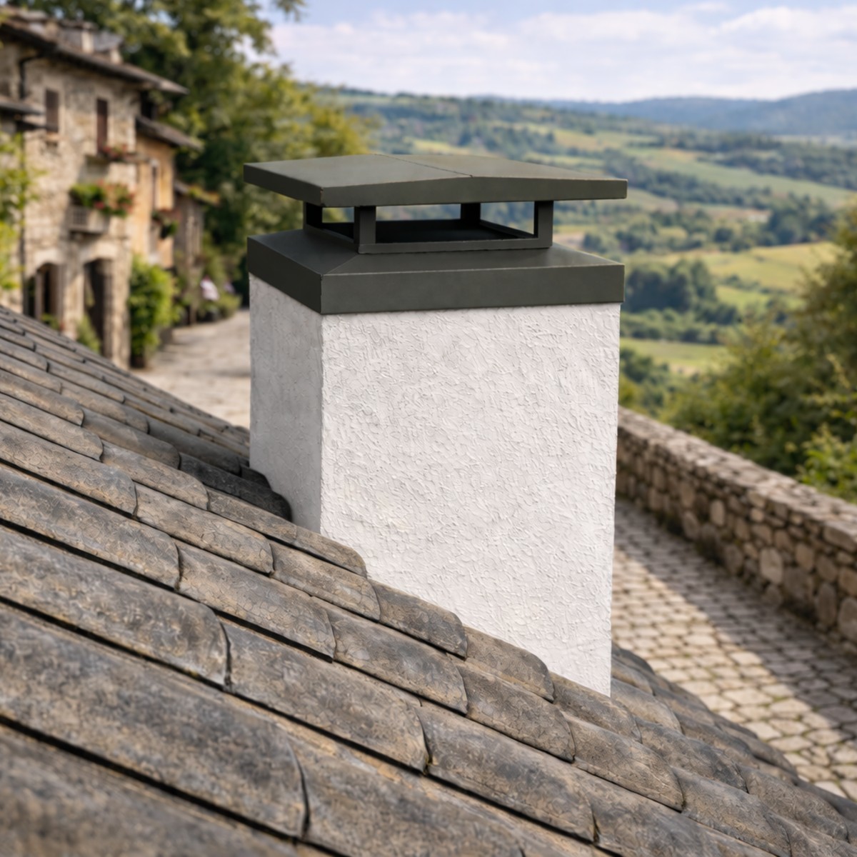 - Hueco interior "menos 90 mm" por lado. Por ejemplo, si la chimenea mide 500x500 exterior, el hueco interior del sombrero será de 320x320 mm
